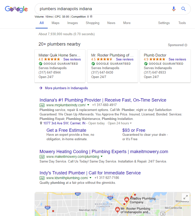 Check out this screenshot from January 2019 of a Google search for the phrase “plumbers indianapolis indiana” – and look for the free, organic results: