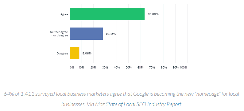 64% of marketers agree that Google is becoming the new “homepage” for local businesses: a user looking at a Google Knowledge Panel can get basic business info, make a phone call, get directions, book something, ask a question, take a virtual tour, read microblog posts, see hours of operation, thumb through photos, see busy times, read and leave reviews. Without ever having to click through to a brand’s domain, the user may be fully satisfied.